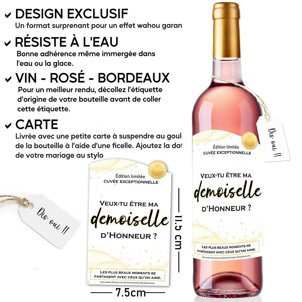 Nous avons aussi des collerettes à poser directement sur la bouteille ! « Veux-tu être mon témoin ? » , « On va se marier ! », … une collerette belle et originale que vous pourrez garder en souvenir.